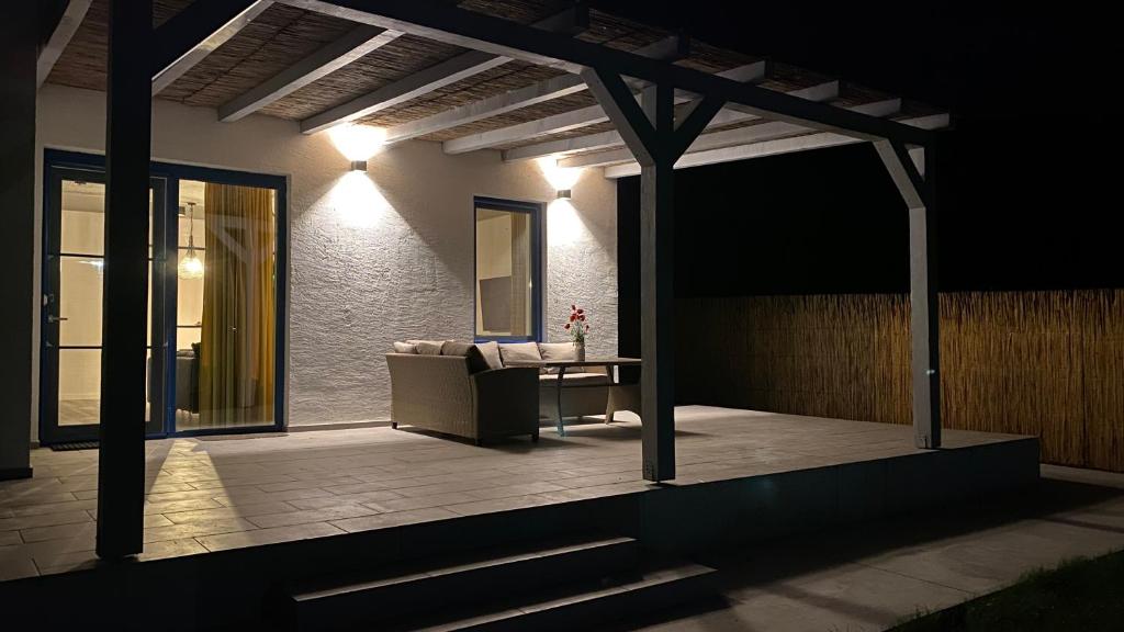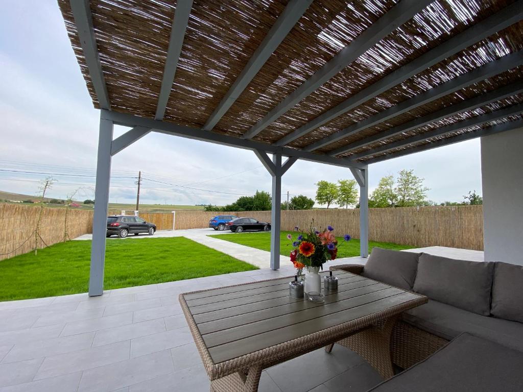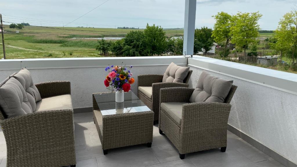 Cea de la parter este dotata cu o canapea pentru 6 persoane si ofera o priveliste linistitoare in curtea din fata. Terasa de la etaj asigura accesul la cele doua dormitoare de la etaj dar poate sa fie utilizata si pentru servirea cafelei de dimineata sau a unui pahar de vin seara, datorita privelistii minunate la Lacul Sarat si la islaz.